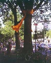 In "a summer fairy-tale", Jay Koh sarcastically reminded the public about the myth of happiness (1). The title was Koh's ironic strategy, as a curator, to the making of art in a cynical commercial art market system. "a summer fairy-tale" was a dark joke without happy beginning, middle or end. It was a group show consisting only of three artists due to lack of funding. A collaborator, curator, artist, father and scientist all wrapped into one, Koh is a culturalist in every sense of the word. His work and projects represent socio-political issues from the perspective of a man living in real exile. Koh was literally forced to leave his homeland in Singapore in 1978 because of what he refers to as his "oppositional activities". Being a refugee, Koh's artistic practice has generally been restricted to Germany. However, in the last two years, he has been permitted to travel abroad to work in places such as New York, Europe and Thailand. Subsequently, Koh's works present recurring thematic issues such as the displaced element and in particular the placement of the displaced element (2). Koh refers to this as a concern for what he calls "the foreign value" (3). This foreign "value" or "virtue" or "ethic" is a constant in Koh's work. He creates an environment that represents the foreign value and presents it to the public in the form of a curated exhibition or a work of his own. In "a summer fairy-tale" Koh also featured the work of the Dutch artist Johan Wagenaar and Takashi Soga from Japan. Together, the three foreign artists formed a mythological triad which intervened at Rudolfplatz in Cologne. The works by all three artists share a fragile temporariness that upsets the permanence of culture, (i.e. mono vs. multi cultural). Wagenaar's plaster cast of a dead horse titled "...and a dead horse" was placed before the castle's gates at Rudolfplatz and ridiculed German chivalry from a Dutch perspective on European history (i.e. war with Germany). Takashi Soga's delicately balanced work titled "Gravitation Quality - Vessel - House" was situated before a large banking institution, and represented for Koh the "illusion of security" and a "mocking of greatness". Takashi Soga's work, however, was vandalised. Both of these works were vulnerable interventions that outraged the public, not because of animal rights activist or structural problems, but because of their "foreign" presence. Koh himself presented a work titled "The most Honourable Citizen", whereby he ridicules the hero prize system with its feedback within regional and national societies. Koh wrapped a chestnut tree in gold cloth to denote its otherwise unimportant function as "ornament and environmental janitor". Three small Japanese bells (Suzu) were also hung on one of the branches, a subtle way to bring attention to the work. As the fabric twists, so does the logic behind Koh's work. The title "The most Honourable Citizen" or "Der ehrenwerteste Bürger" is readable to the German public. However, there are certain elements which are not. Use of the golden cloth communicates foreign codification in the work of Asian/Buddhist tradition. (The cloth may not be at first (if ever) understood by the German Euroburger who experiences it. The golden cloth can symbolise intellectual enlightenment with respect to Buddhism (a common sight in Asia), or it can refer to Asian nobilities, or Asia itself or "something" Asian, but in particular it symbolises the foreign. The tree, however, is a universal symbol for most cultures. For many the forest was the first temple or holy place. This is Koh's second work involving the use of a tree. In 1993 he presented "Zustand" ("Situation"), whereby the cut remains (5m) of a giant oak tree which included root system bound in the middle with steel cable was exhibited at Halle Kalk in Cologne (3). Koh found the oak tree in the Westerwald which had been blown down by a storm in 1992. Hence, Koh's work spans beyond political sarcasm and at moments tends to sway into poetic romantic (sometimes sentimental) cultural sacredness. However ideals exists only in fairytales. According to Koh, the honourable citizen was stripped bare when someone stole the cloth, or as he more generously phrases it: "The cloth was just taken away". Yvonne Parent