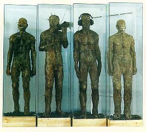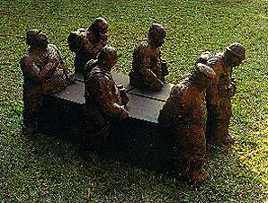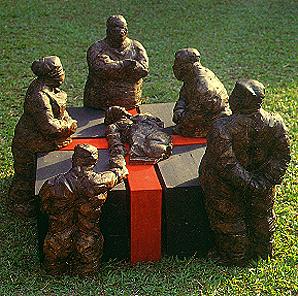 I have been working in many media to represent my feelings. My feeling is represented in my works and my feelings stem from my social and political atmosphere. We are constantly confronted with two contradictory powers in our pursuit for happiness and achievement. The two are characterised by dark and light, truth and false, God and Devil, yes and no, exploiter and exploited. In my sculptures the exploiters are bulky and look like beasts and the exploited are like the heavy workers. First I make them with clay and then cast in cement. I think men cannot stand up without their base. I presented them with black colour to signify the darkness of the world.