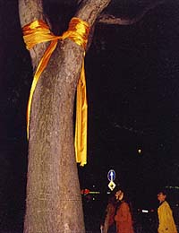 In "a summer fairy-tale", Jay Koh sarcastically reminded the public about the myth of happiness (1). The title was Koh's ironic strategy, as a curator, to the making of art in a cynical commercial art market system. "a summer fairy-tale" was a dark joke without happy beginning, middle or end. It was a group show consisting only of three artists due to lack of funding. A collaborator, curator, artist, father and scientist all wrapped into one, Koh is a culturalist in every sense of the word. His work and projects represent socio-political issues from the perspective of a man living in real exile. Koh was literally forced to leave his homeland in Singapore in 1978 because of what he refers to as his "oppositional activities". Being a refugee, Koh's artistic practice has generally been restricted to Germany. However, in the last two years, he has been permitted to travel abroad to work in places such as New York, Europe and Thailand. Subsequently, Koh's works present recurring thematic issues such as the displaced element and in particular the placement of the displaced element (2). Koh refers to this as a concern for what he calls "the foreign value" (3). This foreign "value" or "virtue" or "ethic" is a constant in Koh's work. He creates an environment that represents the foreign value and presents it to the public in the form of a curated exhibition or a work of his own. In "a summer fairy-tale" Koh also featured the work of the Dutch artist Johan Wagenaar and Takashi Soga from Japan. Together, the three foreign artists formed a mythological triad which intervened at Rudolfplatz in Cologne. The works by all three artists share a fragile temporariness that upsets the permanence of culture, (i.e. mono vs. multi cultural). Wagenaar's plaster cast of a dead horse titled "...and a dead horse" was placed before the castle's gates at Rudolfplatz and ridiculed German chivalry from a Dutch perspective on European history (i.e. war with Germany). Takashi Soga's delicately balanced work titled "Gravitation Quality - Vessel - House" was situated before a large banking institution, and represented for Koh the "illusion of security" and a "mocking of greatness". Takashi Soga's work, however, was vandalised. Both of these works were vulnerable interventions that outraged the public, not because of animal rights activist or structural problems, but because of their "foreign" presence. Koh himself presented a work titled "The most Honourable Citizen", whereby he ridicules the hero prize system with its feedback within regional and national societies. Koh wrapped a chestnut tree in gold cloth to denote its otherwise unimportant function as "ornament and environmental janitor". Three small Japanese bells (Suzu) were also hung on one of the branches, a subtle way to bring attention to the work. As the fabric twists, so does the logic behind Koh's work. The title "The most Honourable Citizen" or "Der ehrenwerteste Bürger" is readable to the German public. However, there are certain elements which are not. Use of the golden cloth communicates foreign codification in the work of Asian/Buddhist tradition. (The cloth may not be at first (if ever) understood by the German Euroburger who experiences it. The golden cloth can symbolise intellectual enlightenment with respect to Buddhism (a common sight in Asia), or it can refer to Asian nobilities, or Asia itself or "something" Asian, but in particular it symbolises the foreign. The tree, however, is a universal symbol for most cultures. For many the forest was the first temple or holy place. This is Koh's second work involving the use of a tree. In 1993 he presented "Zustand" ("Situation"), whereby the cut remains (5m) of a giant oak tree which included root system bound in the middle with steel cable was exhibited at Halle Kalk in Cologne (3). Koh found the oak tree in the Westerwald which had been blown down by a storm in 1992. Hence, Koh's work spans beyond political sarcasm and at moments tends to sway into poetic romantic (sometimes sentimental) cultural sacredness. However ideals exists only in fairytales. According to Koh, the honourable citizen was stripped bare when someone stole the cloth, or as he more generously phrases it: "The cloth was just taken away". Yvonne Parent